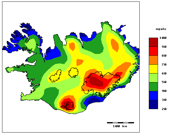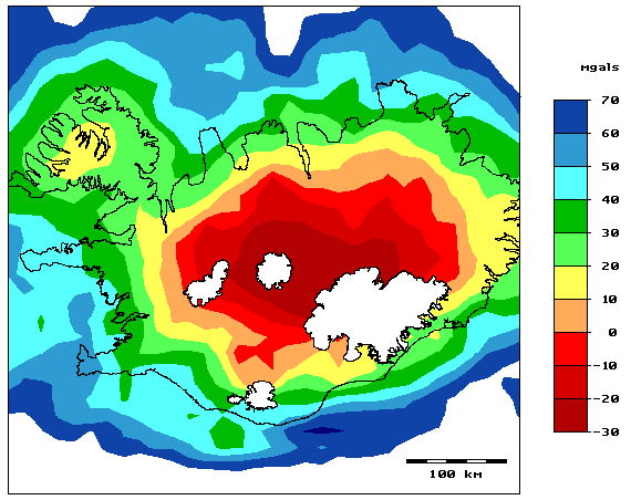 Meðalhæð landslags um miðbik Íslands er um 1000 metrar. Ef gert væri ráð fyrir því að landslagið væri í fullkomnu flotjafnvægi - jafnvægisflöturinn sléttur við sjávarmál - þá mætti eðlisþyngd bergsins ekki vera nema um 1800 kg/m3 til að passa við 75 milligal Bouguer-frávik! Skýringin er auðvitað það sem kemur fram hér að framan: jafnvægisflöturinn er ekki sléttur heldur lyftist hann upp um allt að 300 metra. Hæð landslagsins sem leiðrétta þarf fyrir er því mun minni en hæð yfir sjávarmáli og það stemmir ágætlega við eðlisþyngd bergs nærri 2600 kg/m3.