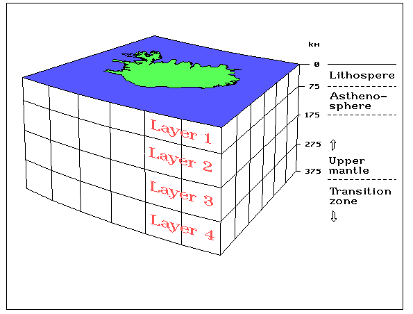 Mynd 5. Reiknilíkan fyrir sneiðmynd af hljóðhraðaÍ greininni er stillt upp reiknilíkani af jarðskorpu og efri hluta möttuls undir Íslandi. Reiknilíkanið nær frá 11° til 26° vestlægrar lengdar, frá 61.8° til 67.9° norðlægrar breiddar, frá yfirborði jarðar niður á 375 km dýpi. Þessum kassa er deilt niður í 6×6×4 minni blokkir og ferlar allra mældra jarðskjálftabylgna raktir í gegnum blokkirnar. Þannig fæst gróf mynd (6×6 blokkir) af breytileika í hljóðhraða á fjórum dýptarbilum. Efsta lagið nær niður á 75 km dýpi og svarar nokkurn veginn til stinnhvolfsins. Hin þrjú eru í 100 km þykk hvert um sig og ná samtals niður á 375 km dýpi.