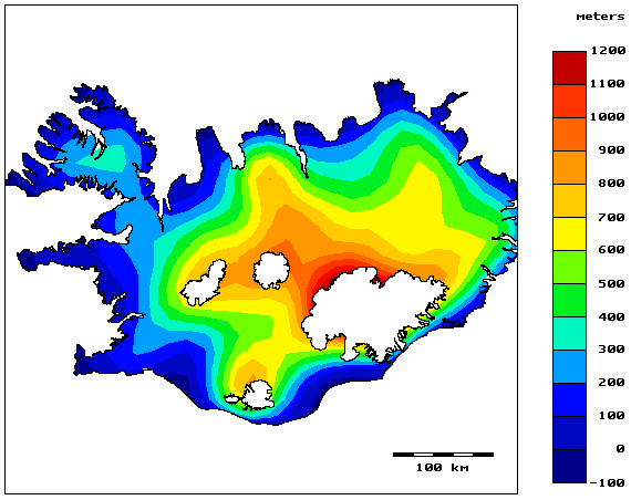 Hér hefur lögun hins fljótandi lands einfaldast mikið frá mynd 1 og er í aðalatriðum eins og búast má við: Landið rís hæst yfir miðju heita reitsins undir vestanverðum Vatnajökli og rek plötuskilanna til ASA skilur eftir slóða til VNV. Með því að fikta í Bouguer-eðlisþyngdinni sem notuð er til að reikna út hæð jafnvægisflatarins væri hægt að skerpa þessa höfuðdrætti í mynd 3 enn frekar, en hér er valin sú leið að nota þessi hefðbundin gildi.
